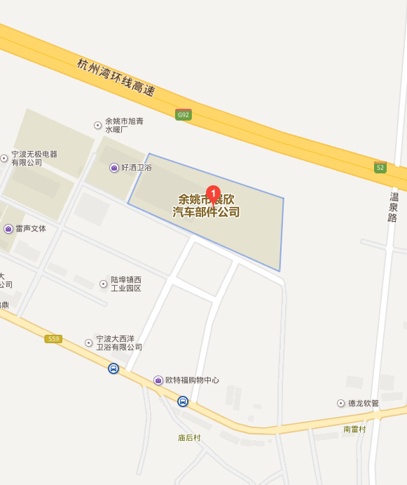 余姚市展欣汽車部件有限公司,地處寧(波)紹(興)平原中心,位于風(fēng)景秀麗的浙江省余姚市陸埠鎮(zhèn)西工業(yè)園區(qū)。緊靠杭甬高速和蕭甬鐵路,近臨杭州灣跨海大橋,距河姆渡遺址10公里,距寧波櫟社國際機(jī)場(chǎng)40公里,距杭州蕭山國際機(jī)場(chǎng)80公里,交通便捷。
